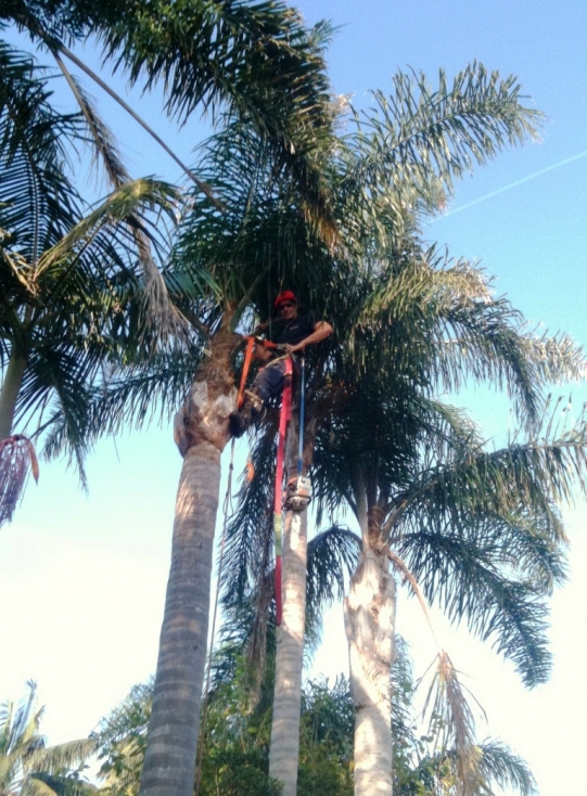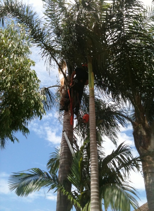 Services: Palm Tree Pruning A large majority of our work at Sydney Palms is the ongoing maintenance and pruning of Cocos Palms, Canary Island Date Palms and Washingtonia Palms. Palm tree pruning, is carried out using specialist arboricultural equipment. All waste is removed from site. This includes dead leaves, yellowed leaves, berry bunches, yellow flowers, unopened seed bracts and dead seed bracts. We take great care to reduce impacts to your site and your tree. We encourage minimal spiking of your palm tree by using a system of ladders or a non-invasive sling shot climbing method. Sling Shot Method used to Access Palm Tree Crowns A large 2 metre tall sling shot has a weighted ball with a fine hauling line attached to it. A tree team member fires the weighted ball over the crown of the palm using the gaint "Sling Shot Big Shot". A larger diameter life supporting rope is attached to the fine hauling line and pulled through the crown of the palm. A climber can then safely access the palm crown pulling themselves up the rope using a Single Rope Climbing Technique. This method of gaining access the palm crown eliminates spiking of the trunk. Spiking of palm trunks is discouraged as it has negative impacts on palm health allowing entry points for pathogens and insects and looks aesthetically poor. |